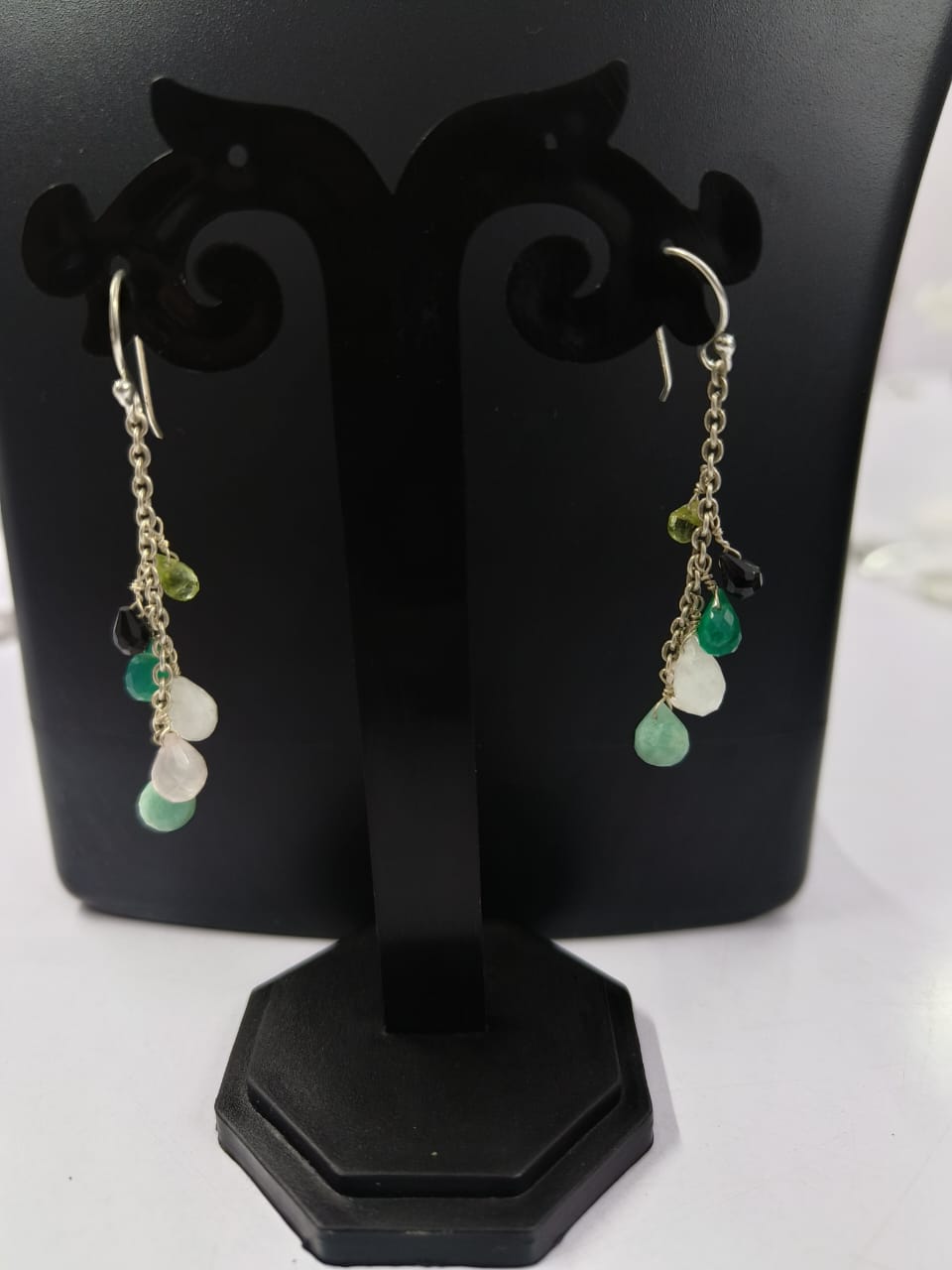 Brighten your jewelry collection with these stunning Multistone Silver Dangle Earrings, designed to add a playful mix of color and elegance to any look. Each earring features a vibrant combination of faceted gemstone drops— including turquoise blue, amethyst purple, smoky grey, rose pink, black onyx, and peridot green—creating a lively cascade that sparkles beautifully with every movement.