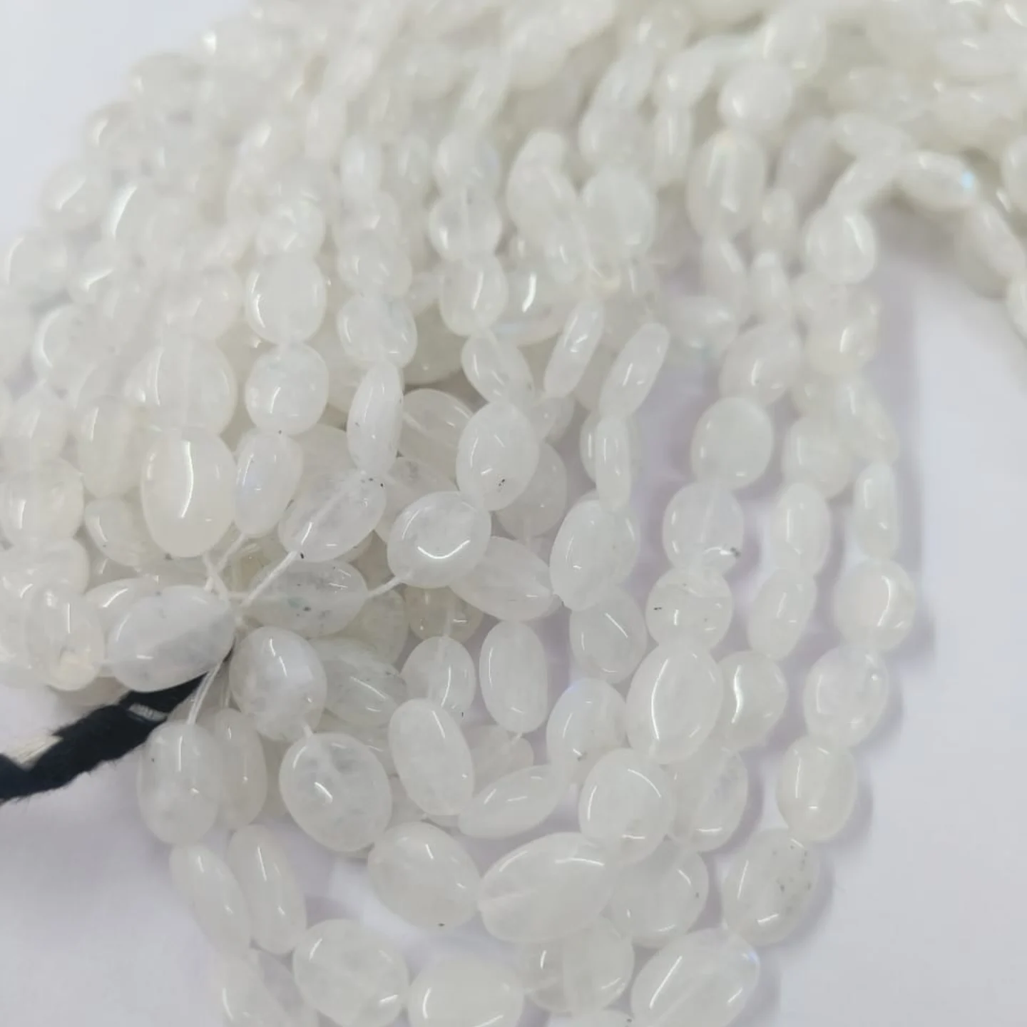 These exquisite Natural White Rainbow Moonstone strands feature smooth, oval-shaped beads with a beautiful milky white sheen. Under light, the stones display subtle flashes of rainbow-like iridescence—one of the signature qualities of genuine moonstone.